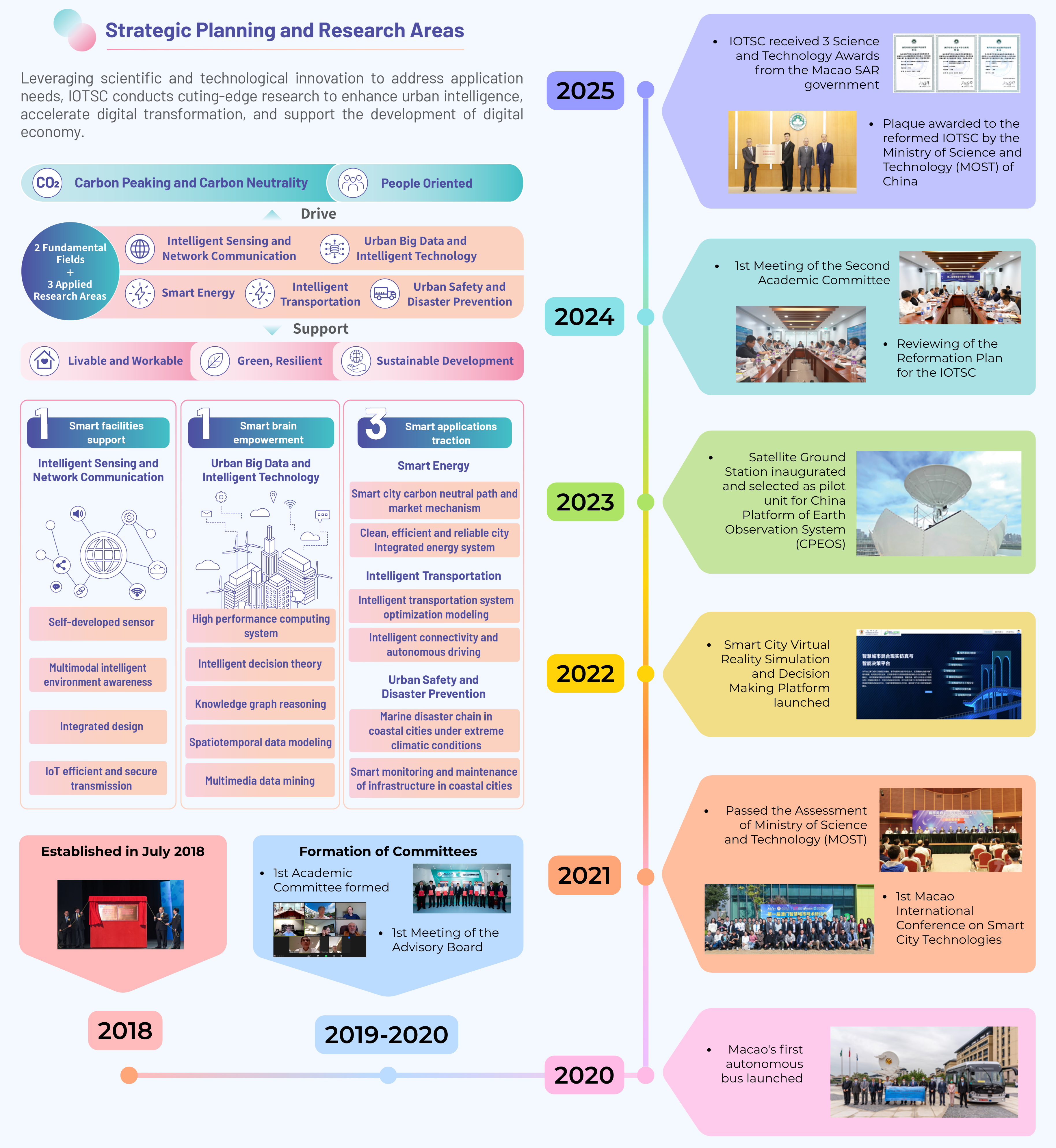 Since its inception, IOTSC has achieved significant advances in both fundamental research and innovation, and has been honored with several prestigious awards, including the Prize for Scientific and Technological Progress of The Ho Leung Ho Lee Foundation, the Second Prize of FDCT S&T Progress Award, the First Prize of the Guangdong Provincial S&T Award, the Third National Innovation Pioneer Award, and the 14th Guanghua Engineering Science and Technology Award, etc. Aims to master key technologies and significantly contribute to the development of smart cities in Macao and China, ensuring a brighter and more innovative future.