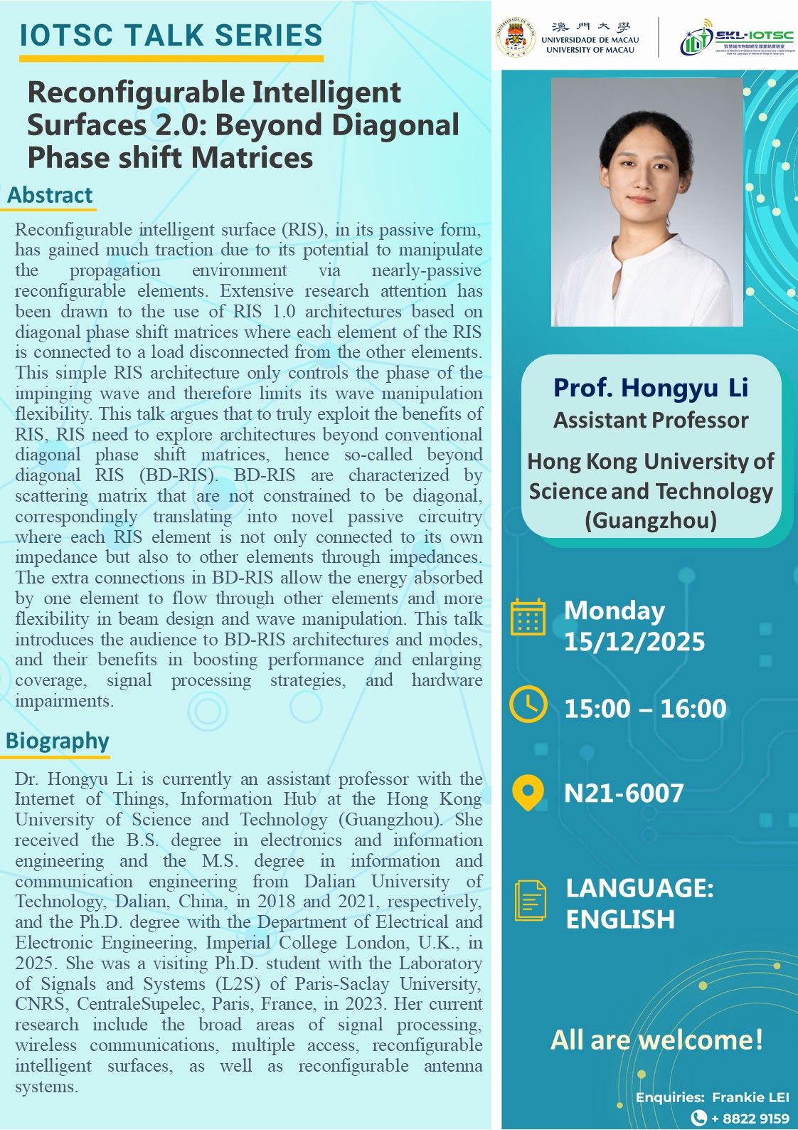 15/12 @ 3:00 pm - 4:00 pm Reconfigurable Intelligent Surfaces 2.0: Beyond Diagonal Phase shift Matrices