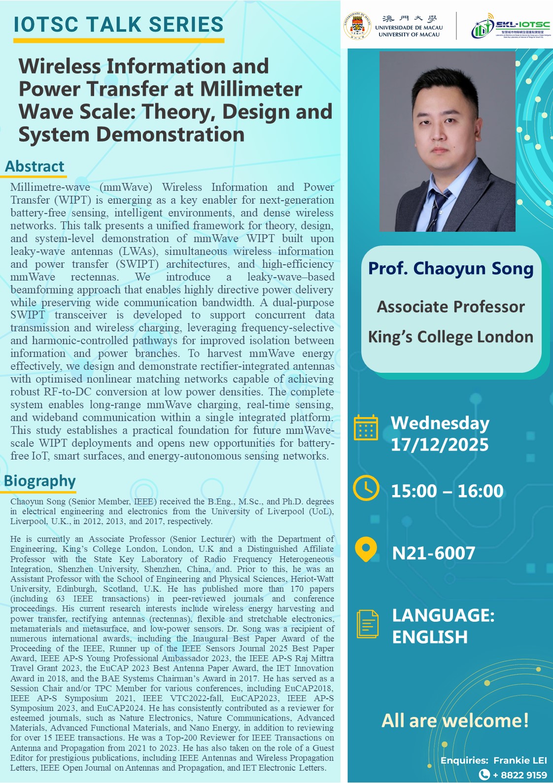 17/12 @ 3:00 pm - 4:00 pm Wireless Information and Power Transfer at Millimeter Wave Scale: Theory, Design and System Demonstration